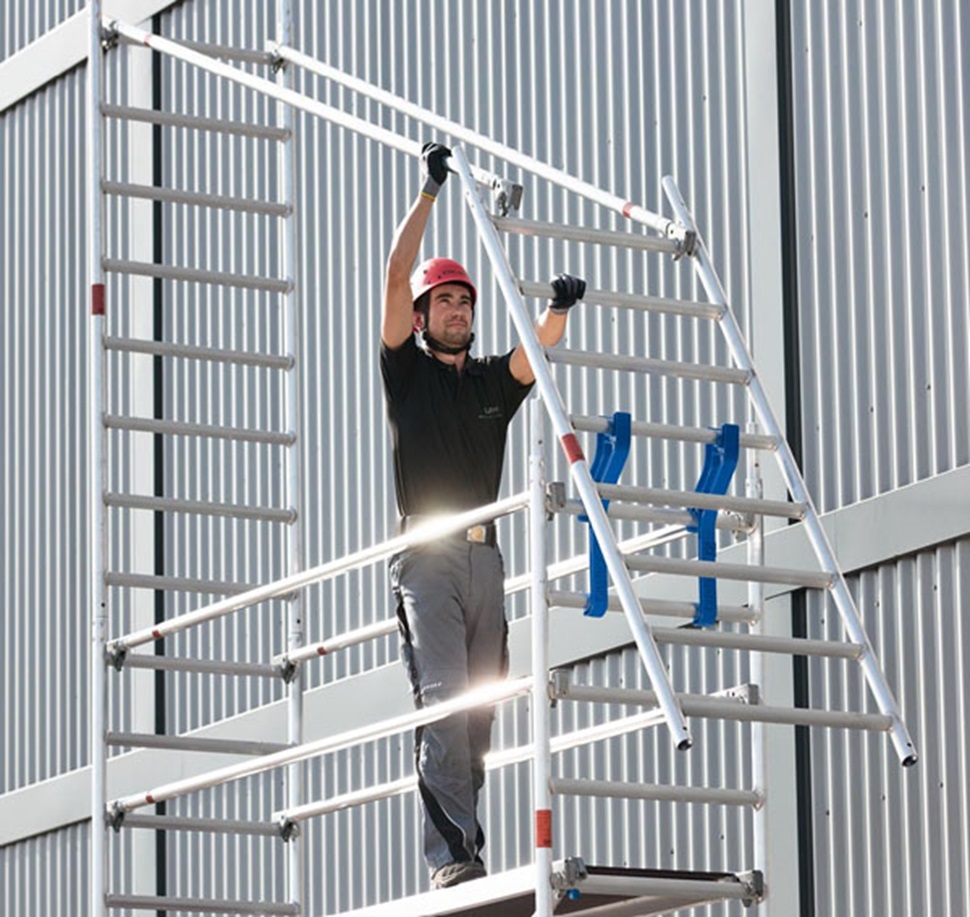 İlk merdiven çerçevesini oturtun. Uni montaj kancalarını bağlayın ve arka korkulukların uyum sağlaması için ikinci merdiven çerçevesini yerleştirin. Arka korkuluklu döner merdiven çerçevesini yukarıya doğru hareket ettirin ve yerine yerleştirin. Çapraz destekleri ekleyin ve platforma ulaşın. Bir sonraki seviyeye çıkın ve 0.50 m’de ek arka korkulukları takın.