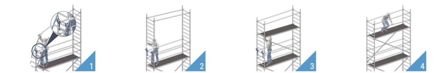 İlk merdiven çerçevesini oturtun. Uni montaj kancalarını bağlayın ve arka korkulukların uyum sağlaması için ikinci merdiven çerçevesini yerleştirin. Arka korkuluklu döner merdiven çerçevesini yukarıya doğru hareket ettirin ve yerine yerleştirin. Çapraz destekleri ekleyin ve platforma ulaşın. Bir sonraki seviyeye çıkın ve 0.50 m’de ek arka korkulukları takın.