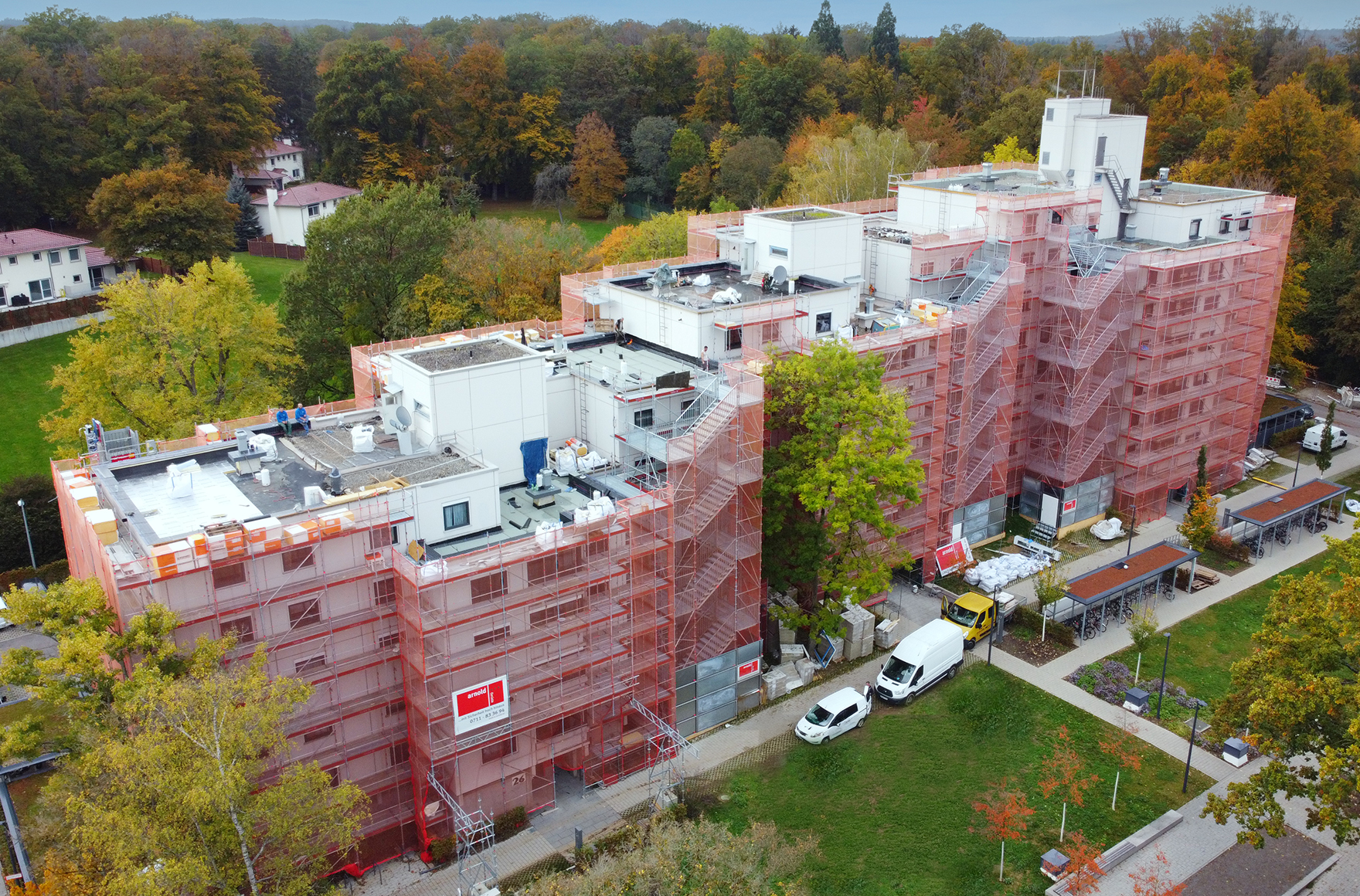 cephe iskelesi, brandalar ve ağlarla kaplıdır. Layher iskele branda ve ağları, DIN 4420-1 normu